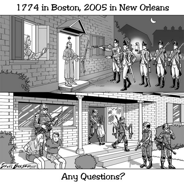 Our hearts go out to all those affected by the recent catastrophe in the southern states due to hurricane Katrina, Let’s hope de federal gubmint doesn’t find some way to turn this unfortunate situation into an opportunity to tighten the noose of tyranny just a bit more.